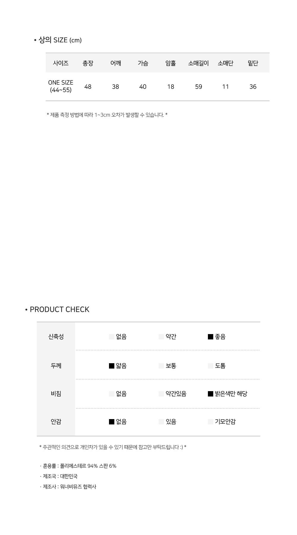 | Measurements are made with the garment laid flat. (The size may differ by 1~3cm) | ||||||