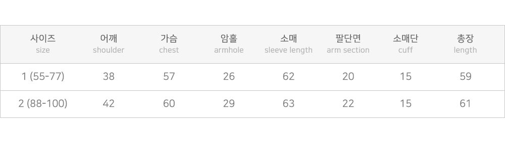 | Measurements are made with the garment laid flat. (The size may differ by 1~3cm) | ||||||