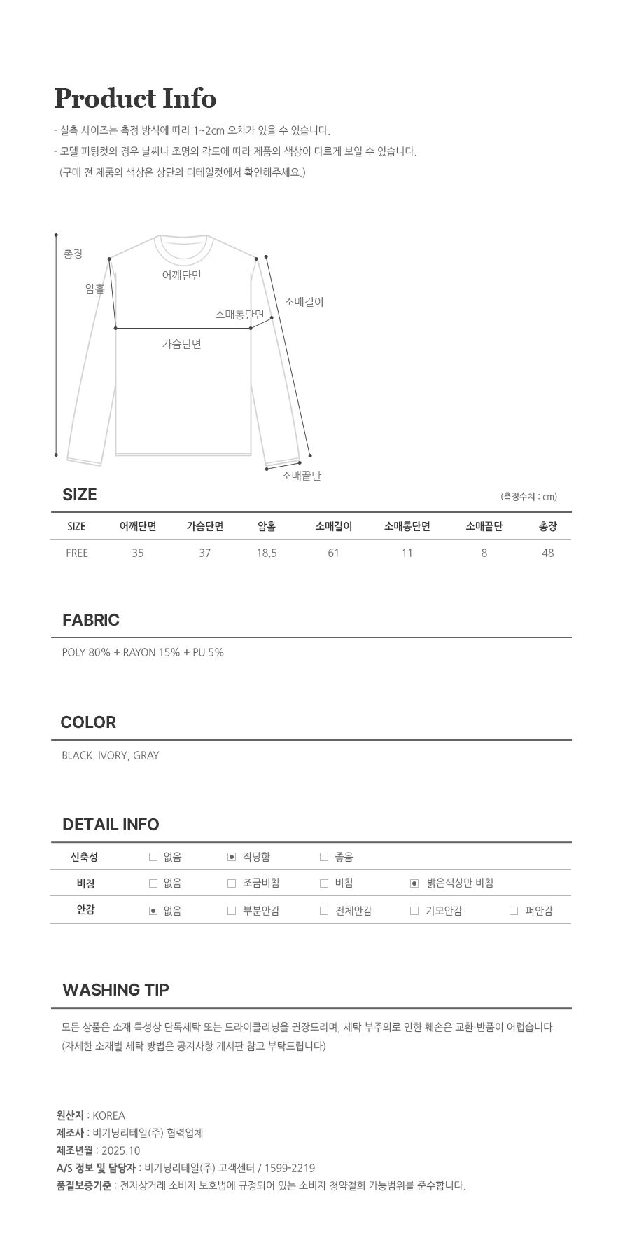· Dry cleaning is recommended for the first wash of all clothes, please start wearing after washing.