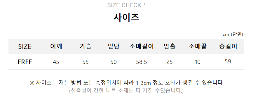 | Measurements are made with the garment laid flat. (The size may differ by 1~3cm) | ||||||